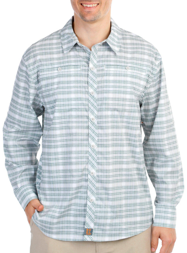 Elevate your outdoor adventures with the Reel Legends Terrain Button Down Long Sleeve Shirt. Designed for the rugged explorer, this shirt features double buttoned chest pockets for secure storage, built in sun-protection, snag-resistant fabric for durability, and strategic venting to keep you cool. The built-in sunglass cleaner ensures clear vision, while pinned rolled cuffs offer versatile styling. Fabrication is 75% polyester, 22% cotton, and 3% spandex.