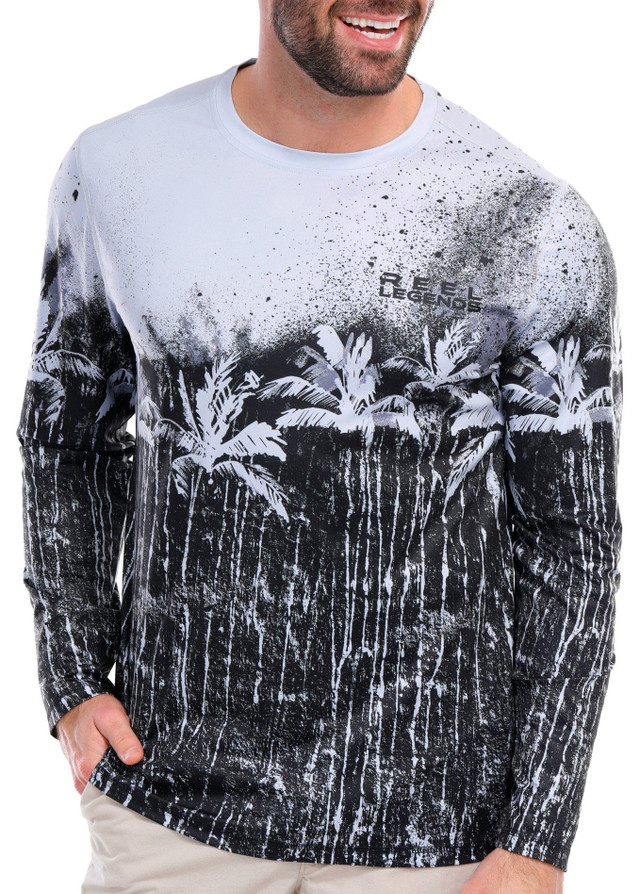 Stay cool and protected with our Men's Long Sleeve Reel-Tec Shirt. Featuring a striking Wild Palms Print Design, this shirt combines style with advanced functionality. The sweat-activated cooling technology ensures you stay comfortable even on the hottest days, while the built-in sun protection shields you from harmful UV rays. Perfect for outdoor adventures, this shirt is designed to keep you looking sharp and feeling great all day long. Material is 100% recycled.