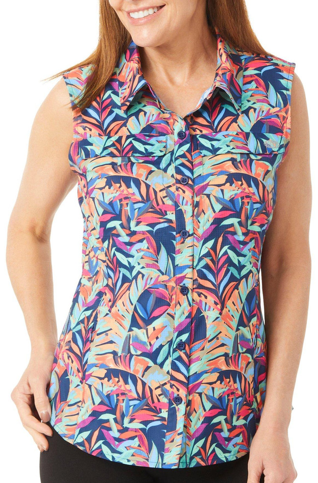 Make a statement with the Ultra Mariner Buttoned Sleeveless Top. Featuring a vibrant and colorful print pattern, this top is designed to stand out. The double chest pockets add a touch of utility, while the vented back panel ensures breathability and comfort. With double zipped front pockets, this top combines practicality with style. Perfect for warm weather or layering under a jacket. The top length measures approximately 24 in. Fabrication 100% polyester.
