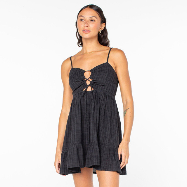 Featuring a strappy lace-up front, defined waistline, and flared ruffle skirt, this dress exudes effortless charm and style. Crafted from a breezy double weave linen-viscose blend fabric, it offers both comfort and sophistication, with adjustable straps and a smocked back ensuring the perfect fit for any occasion. Fabrication 65% cotton, 35% viscose