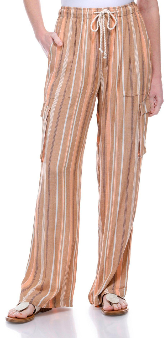 Introducing the Juniors Precious Striped Cargo Pants, crafted from 100% viscose for a lightweight and comfortable feel. These pants feature a stylish striped print, a drawstring waistband for adjustable comfort, and both side seam and cargo pockets for added functionality. With a straight leg fit and a 29-inch inseam, they offer a trendy and versatile look perfect for any casual occasion.