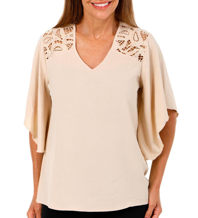 This women's top features a soft solid color with elegant short batwing sleeves. Delicate crochet accents add charm to the sleeves while the v neckline offers a flattering touch. Perfect for casual days or dressed up evenings this top blends comfort with effortless style. Fabrication 100% polyester