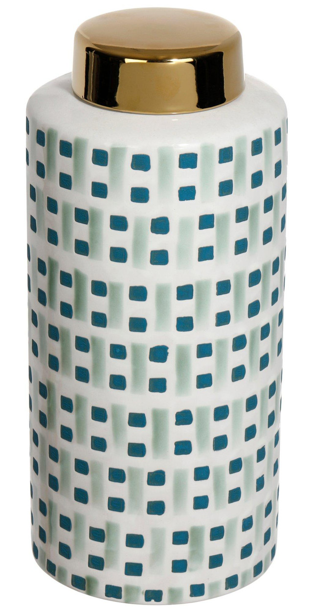 Add a touch of elegance to your home with this Ceramic Print Jar Vase. Featuring intricate patterns and a glossy finish, this vase is perfect for showcasing fresh flowers or as a standalone decorative piece. Its sturdy ceramic construction ensures durability, while the timeless design complements any decor style. Measures approximately 12 in x 5.5 in x 5.5 in.