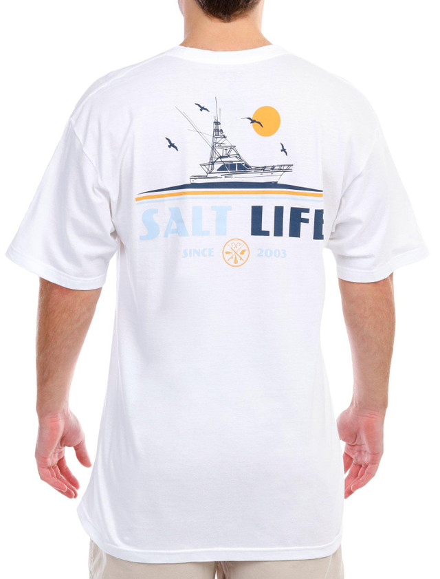 Embrace every adventure with the Men's A Day In The Life T-Shirt. Made from 100% preshrunk cotton, this shirt features a logo script on the chest and a captivating back graphic design. Perfect for both land and sea adventures, it combines comfort and style, making it a versatile addition to your wardrobe. Enjoy the perfect blend of functionality and fashion with this unique t-shirt!