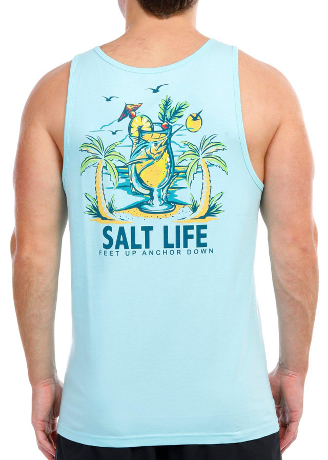 Stay cool and stylish with the Men's Drink Up Graphic Tank Top. Made from 100% cotton, this tank top features a vibrant tropical drink graphic print on the back and a logo script on the chest. With a comfortable round neckline, it's perfect for both land and sea adventures. Embrace the laid-back vibe and enjoy your adventures in this eye-catching tank top!