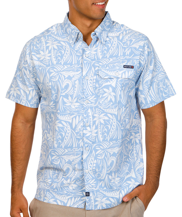Stay cool and protected in the Mens Short Sleeve Mahi Tribe Button Down Shirt featuring a tropical print, front chest pocket, and classic button front design. Made with SLX Performance fabric offering UPF 30 sun protection, moisture wicking, antimicrobial properties, stretch, and mesh vents for breathability. Ideal for outdoor adventures or coastal getaways. Fabrication is 97% polyester 3% spandex. Length measures approximately 29 in.