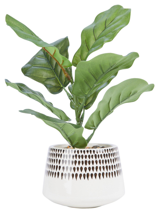 Bring a touch of nature indoors with this stunning 12 in Faux Fiddle Leaf Plant, elegantly set in a stoneware pot. The lifelike leaves add a fresh feel to any room, without the need for any maintenance. Perfect for brightening up your living space, office, or any corner that needs a bit of greenery, this faux plant offers a timeless and versatile decor option. Measures approximately 12 in x 9 in.