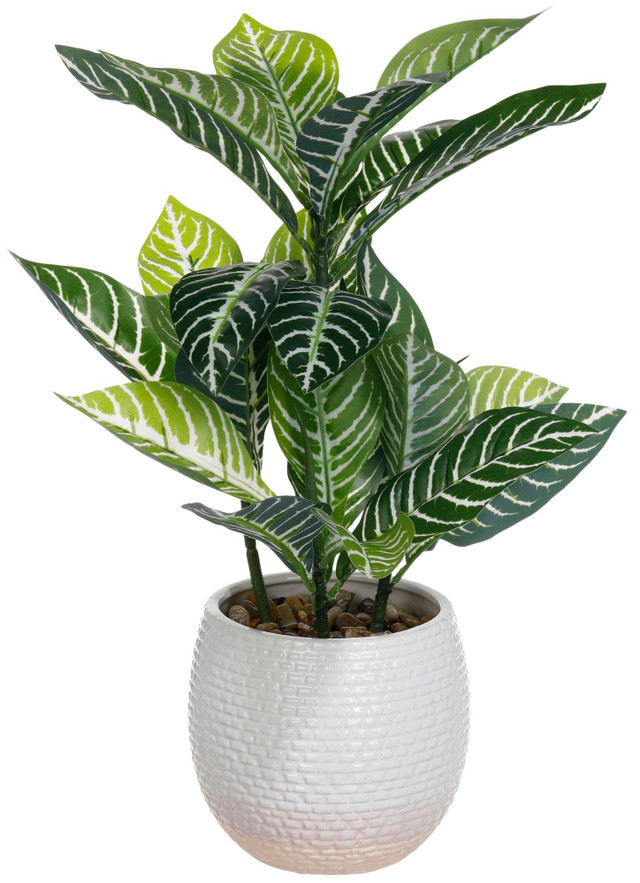 Bring a touch of nature indoors with this stunning 21.5 in Faux Zebra Plant, elegantly set in a ceramic pot. The lifelike leaves add a fresh feel to any room, without the need for any maintenance. Perfect for brightening up your living space, office, or any corner that needs a bit of greenery, this faux plant offers a timeless and versatile decor option. Measures approximately 21.5 in x 13 in.