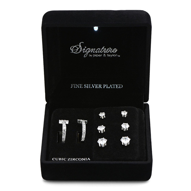The Signature 4-Pc. CZ Hoop & Stud Earrings Set includes two pairs of classic hoop earrings and two pairs of sparkling cubic zirconia stud earrings. The hoops come in different sizes for versatile styling, while the stud earrings offer timeless elegance. Ideal for everyday wear or special occasions, this set provides a variety of options to enhance any look, making it a must-have addition to your jewelry collection.