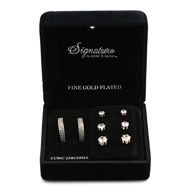 The Signature 4-Pc. CZ Hoop & Stud Earrings Set includes two pairs of classic hoop earrings and two pairs of sparkling cubic zirconia stud earrings. The hoops come in different sizes for a versatile, stylish look, while the stud earrings offer timeless elegance. Perfect for both everyday wear and special occasions, this set provides multiple options to elevate your jewelry collection with a mix of classic and contemporary styles.