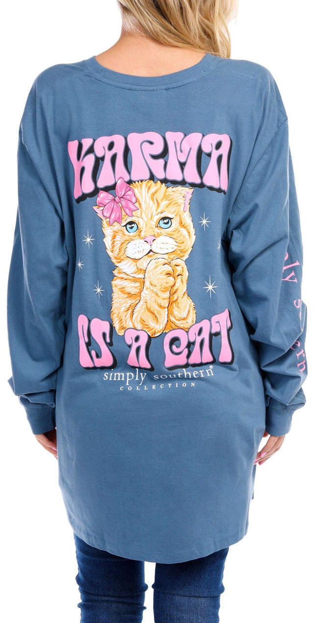Introducing the Juniors Karma Is A Cat Long Sleeve Top, crafted from 100% cotton for ultimate comfort and breathability. This trendy top features long sleeves and a classic crew neckline, perfect for everyday wear. The standout feature is the Karma Is a Cat graphic design, prominently displayed on both the back and chest, adding a playful and unique touch to your outfit. Ideal for cat lovers and those who appreciate a bit of whimsy in their wardrobe, this top is a must-have.