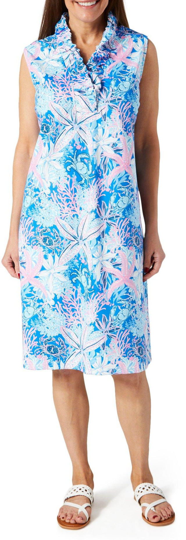 The Women's Reef Printed Dress blends style and comfort seamlessly. Made from 89% polyester and 15% spandex, this dress offers a flattering fit with just the right amount of stretch. The ruffle V-neckline adds a touch of elegance, while the vibrant reef print brings a tropical, eye-catching vibe to any occasion.