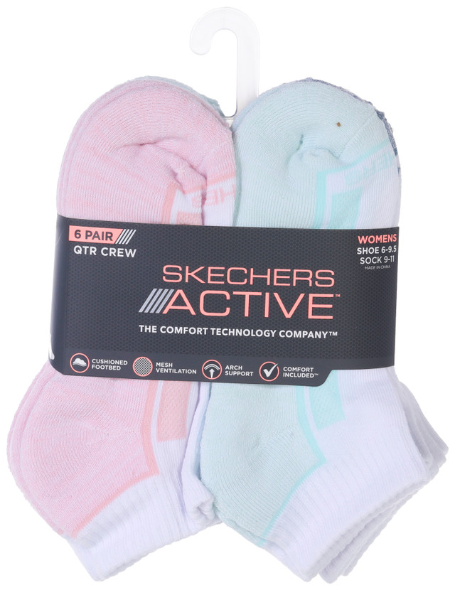 Stay supported through every step with the Womens Active 6 Pack Quarter Crew Socks which offer soft comfort, flexible stretch and a cushioned footbed with mesh ventilation and arch support. The snug stay put design and moisture wicking fabric keep feet fresh and comfortable. The quarter crew cut pairs well with sneakers or casual shoes. Fabrication is 96% polyester 3% rubber 1% spandex.