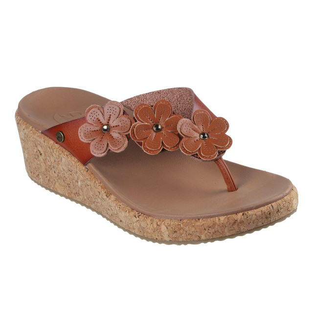 Summery style and absolute comfort combine in Skechers Beverlee wedge sandals. This strappy vegan wedge sandal features an embroidered and laser-cut synthetic upper with an adjustable back strap and a cushioned Luxe Foam footbed.