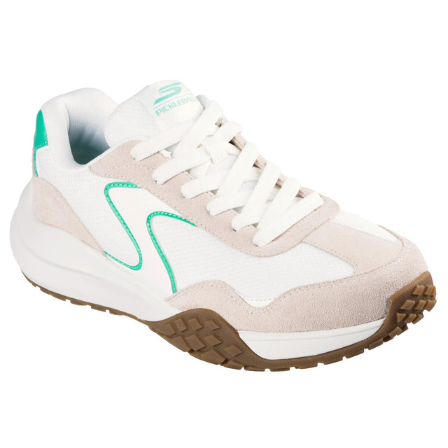 Hit the court in retro-inspired style and modern performance technology wearing Skechers Court Frenzy. Designed specifically for pickleball game play, this lace-up court shoe features a mesh upper with genuine suede overlays, lightweight Move Foam cushioning, and a Goodyear® Gold compound outsole that allows the player to perform controlled slides on the pickleball court surface.