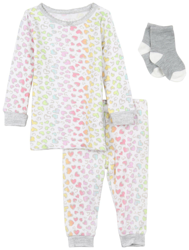 Introducing the Toddler Girls 3 Pc Leopard Hearts Pajama Set, designed for both comfort and cuteness. This adorable set includes a matching long sleeve top and pants, both adorned with an all-over leopard heart print that your little one will love. To complete the look, cozy socks are included, ensuring warmth from head to toe. Perfect for bedtime or lounging around, this pajama set combines playful style with snug comfort, making it a delightful addition to any toddlers wardrobe.