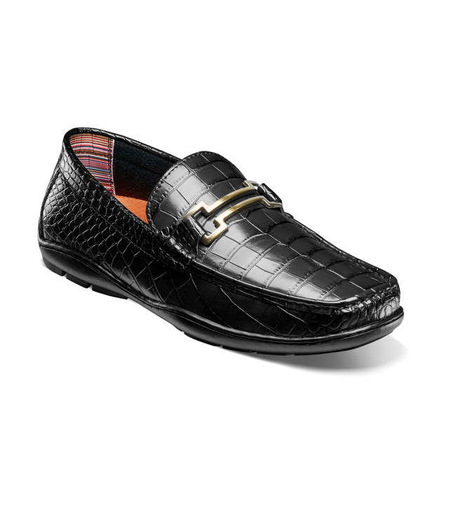 From its crocodile print upper to its eye-catching colors and the elaborate metal bit, the Stacy Adams Embrey Moc Toe Bit Slip On is the hardest working loafer of the season. An attention grabber from every angle, it features a cushioned footbed for all-day comfort, microfiber linings for comfortability, a fully cushioned insole with microfiber footbed cover for added comfort, and a durable man-made outsole.