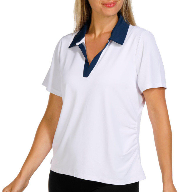 Discover the perfect blend of style and functionality with this Stella Parker top. Featuring side ruche detail and short sleeves, it offers a flattering fit and chic look. The v-neckline with contrast trim adds a touch of elegance, while the micro pique fabric ensures comfort and breathability. With UPF 50 sun protection, it's ideal for active days outdoors. Perfect for any active lifestyle. Model is 5 ft. 8.in. and wearing size small. Fabrication 95% micro pique polyester, 5% spandex