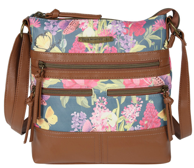 This Beau Jardin Lydia crossbody bag features a vibrant floral print with a lined interior, an adjustable crossbody strap and a secure top zip compartment. Four exterior zip pockets offer convenient storage, making it a stylish and practical everyday accessory. Measures 9 in x 2 in x 9 in