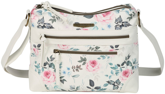 The Vintage Rose Irene Hobo Bag features a floral design on a soft vegan leather fabrication, three exterior zipper pockets, an adjustable crossbody strap, and a top zipper closure. The lined interior contains one zip and two slip pockets total. Measures 10 in x 3 in x 9 in