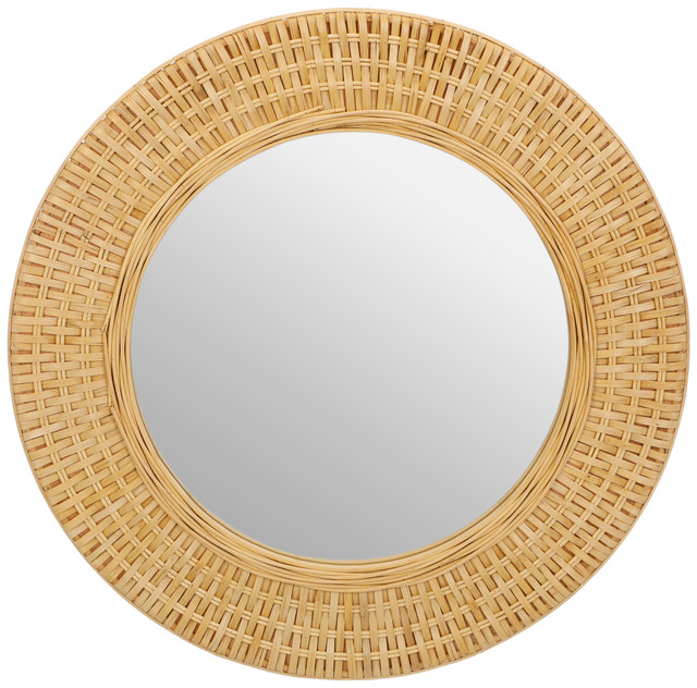 This round wall mirror brings natural charm with its woven bamboo frame and airy design. Perfect for adding texture and warmth to any space, its a stylish accent that brightens your room with effortless elegance. Measures 24 in.