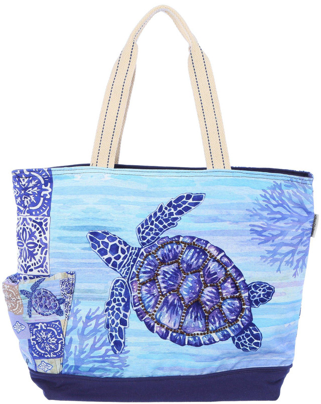 This Beach Shoulder Tote features a stylish pattern and cute turtle design on a woven fabric with dual handles, and a top zipper closure. The lined interior contains one zipper pocket and a slip pocket. Measures approximately 18 in. x 14 in.