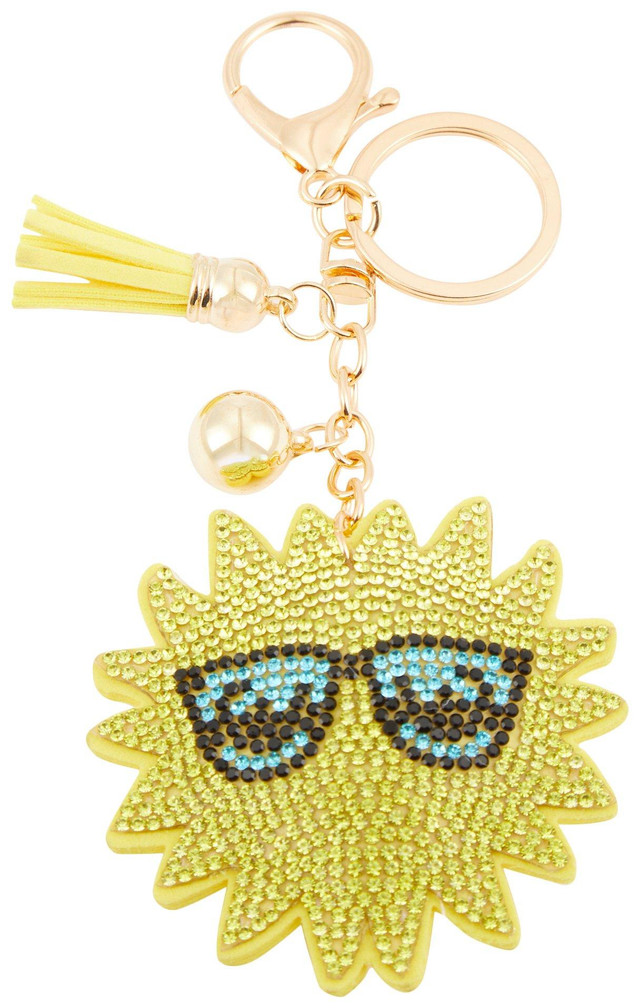 Add a pop of sparkle to your accessories with the Sunshine Bag Charm. Featuring a dazzling rhinestone exterior and a sleek gold lobster clasp, this 2.5-inch charm is the perfect way to brighten up your favorite bag or keychain.
