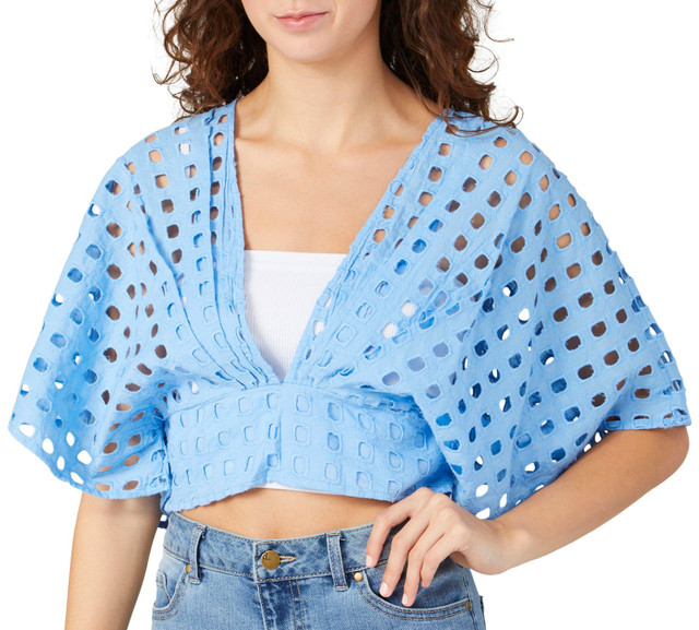 Add a touch of elegance to your wardrobe with our Juniors Eyelet Kimono Top. Made from 100% cotton, this stylish top features a solid color and a deep plunge neckline, perfect for a chic, effortless look. The short sleeves and cropped fit, with a length of 17 inches, make it ideal for pairing with high-waisted jeans or skirts. Whether you're dressing up or down, this eyelet kimono top is a versatile addition to any outfit.