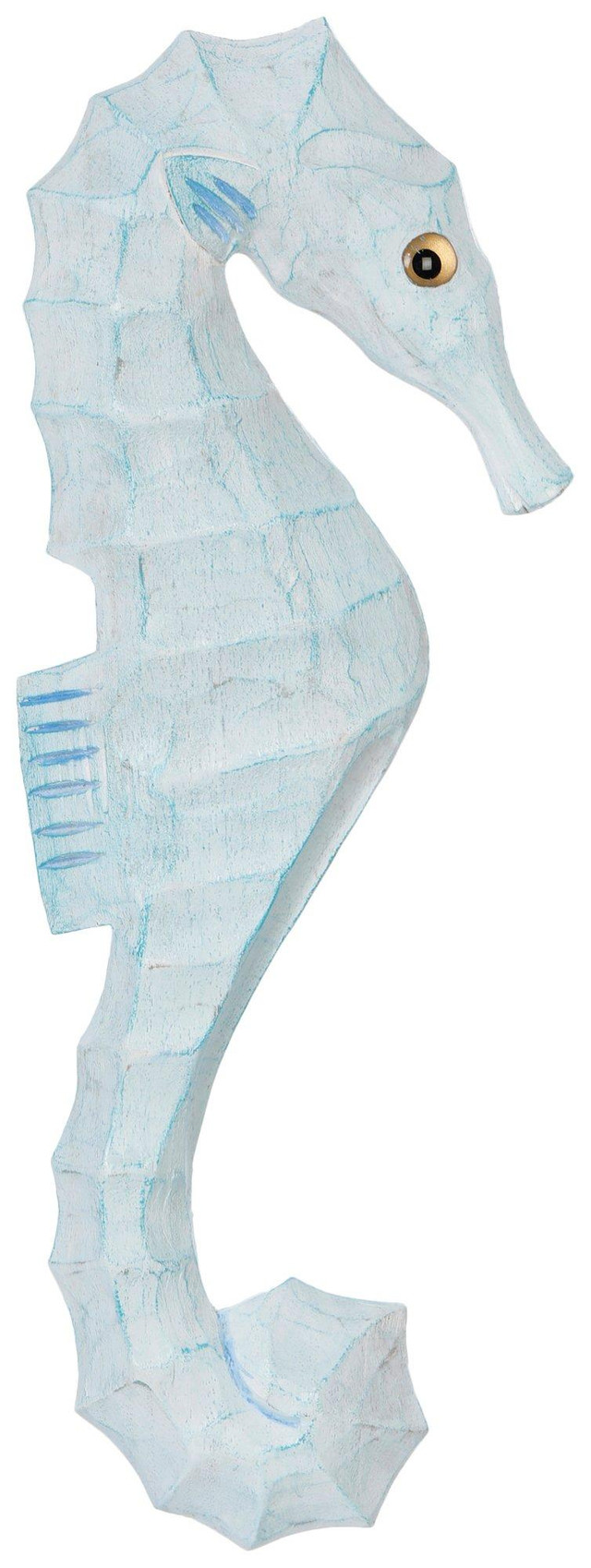 Bring coastal elegance to your walls with the Carved Wood Right Facing Seahorse Wall Decor featuring artisan craftsmanship in light aqua blue green tones with gold eyes and a curled tail. Ideal for adding serene ocean inspired charm to any room. Fabrication is wood. Measures approximately 14.5 in x 5.5 in x 1.25 in.