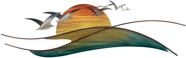 Grace your indoor space, covered porch, or enclosed patio with the beauty of a Peaceful Sunrise. Designed by artist Joanne Ferrara, the handcrafted metal and stainless steel wall sculpture resembles undulating turquoise waves reflecting the golden yellow and orange rising sun as silver seagulls soar along the skyline. Rich hand-dyed shades and hand-grinded textures embellish the lovely design. Sunrise wall art measures 35 x 13 in.