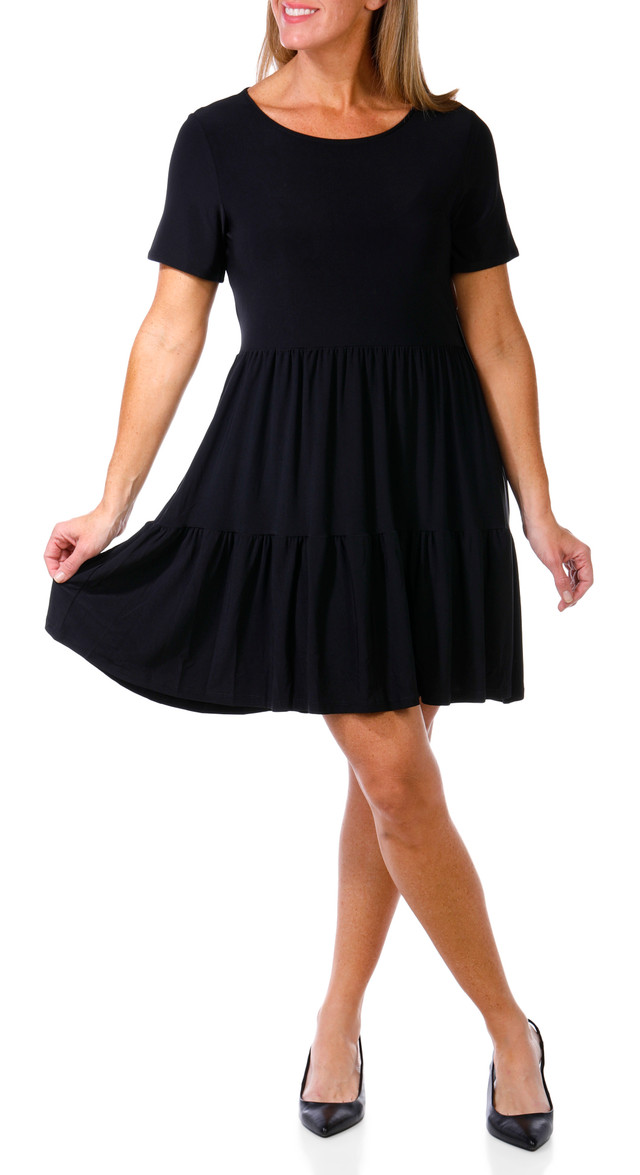 Elevate everyday style with this Womens Short Sleeve Tiered Short Dress, featuring short sleeves, a solid color design, a flattering round neckline, and a short tiered skirt. The soft, stretchy fabric delivers refined comfort and easy movement, making it perfect to dress up or down for work, weekends, or a night out. A perfect little black dress for any wardrobe. Fabrication is 95% polyester, 5% elastane.
