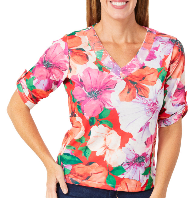 This women's top features a flattering V-neck and three-quarter sleeves for a balanced, elegant look. Adorned with a floral pattern and shimmering sequins along the neckline, it adds a touch of sparkle and charm. Perfect for dressing up your everyday style with a hint of glamour. Fabrication is 100% polyester.