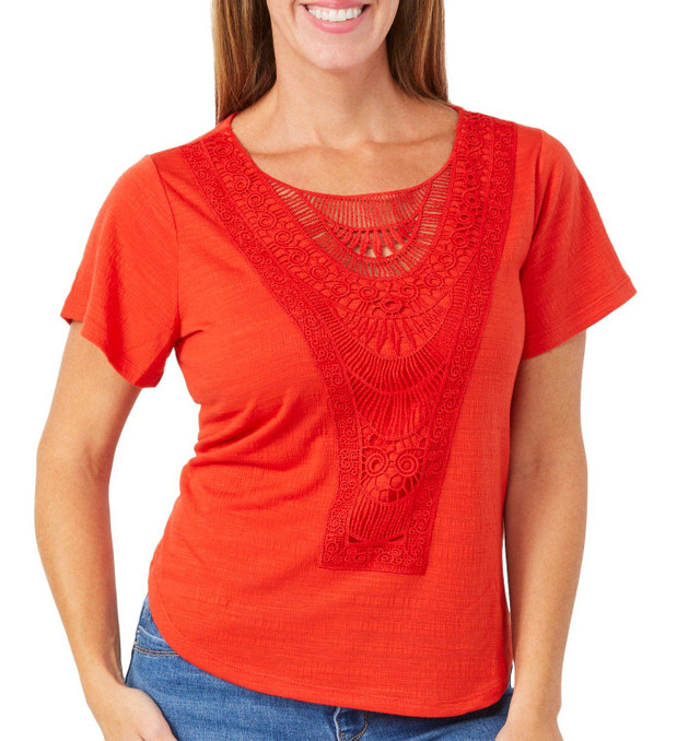 Add a delicate touch to your look with this Women's Short Sleeve Lace Neck Top. Featuring a solid color and short sleeves, its accented with a lace design on the chest for a soft, feminine finish. Ideal for both casual and dressy occasions. Fabrication 71% polyester, 28% rayon, 1% spandex