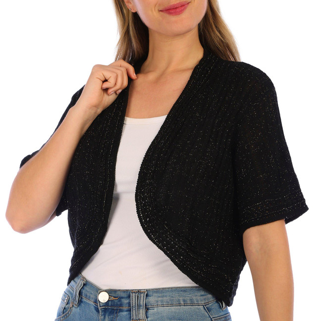 Introducing the Women's Metallic Bolero, crafted from 100% acrylic for a soft and lightweight feel. This stylish bolero features a knit body, an open front design, short sleeves, and a chic cropped length. Perfect for adding a touch of sparkle to any outfit, this bolero combines elegance and versatility effortlessly, making it a must-have addition to your wardrobe. 16 inch length.