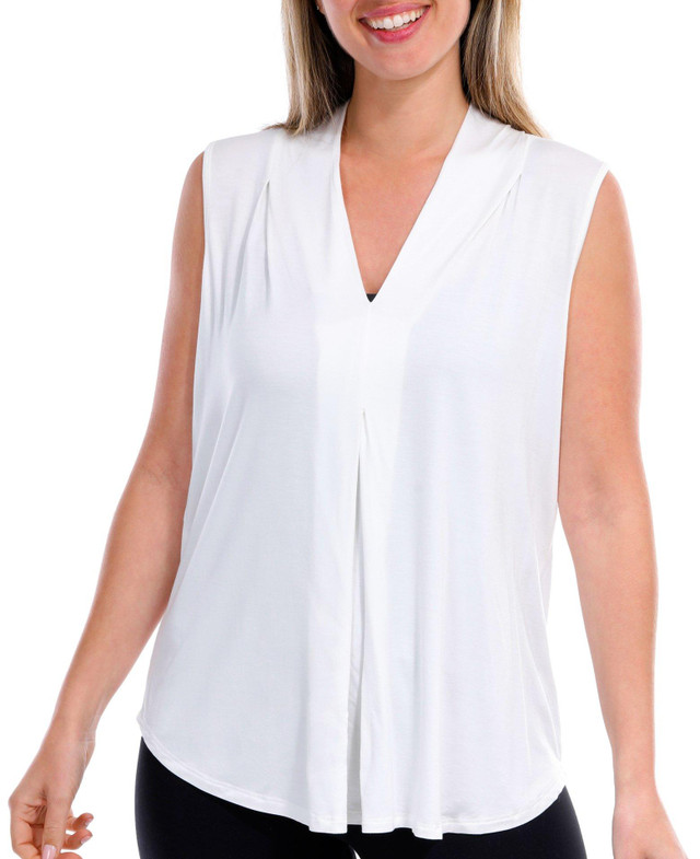 Introducing our chic Sleeveless Top, designed in a versatile solid color that complements any wardrobe. This top features an elegant inverted pleat detail, adding a touch of sophistication and style. Perfect for layering or wearing on its own, it offers a comfortable and flattering fit. Ideal for both casual and dressy occasions, this top is a must-have addition to your collection. Fabrication is 97% viscose, 3% spandex.