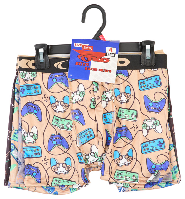 Keep him comfortable all day with the Boys 4 Pack Print Boxer Briefs Underwear, designed with a fun gamer inspired print mix. Soft stretchy fabric and an extra soft waistband provide a secure supportive fit for school, sports or everyday wear. Easy care construction makes them a go to choice for busy days. Fabrication is 90% polyester 10% spandex.