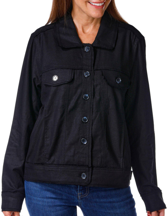 The Two Palms Linen Raw Edge Jacket is a lightweight take on the classic trucker style, crafted from 100% linen for breathable comfort. It features a front button closure, spread collar, and long sleeves with button cuffs. Frayed edges give it a relaxed, well-worn look, while chest button-flap pockets and front on-seam pockets add function. With a 22-inch length and adjustable button tabs at the waistband, this jacket is perfect for layering in warmer weather.