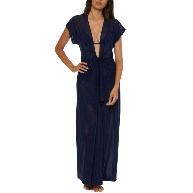 Make an entrance on your next vacation in this sleeveless maxi dress cover-up in sheer, stretch mesh. Pair this swim cover-up dress with a matching swimsuit for a chic poolside look. Features plunge v-neckline, pull-on style, tie front detail and sheer stretch crinkle mesh. Unlined.