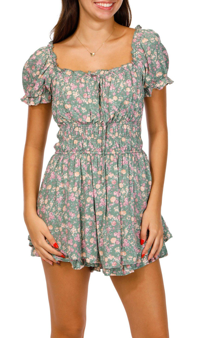 Turn heads in this Juniors Short Sleeve Floral Romper, designed with a trendy faux dress silhouette. Lightweight and breezy, it combines the ease of a romper with the elegance of a flowy skirt overlay. Perfect for sunny days or casual nights out, this floral piece adds effortless charm to your wardrobe. Self Fabrication 100% rayon. Lining Fabrication 100% polyester