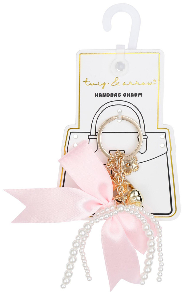 Add a touch of whimsy to any handbag with the Satin Bow Pearls Gold Handbag Charm. Featuring enamel charms of flowers and bows, a big bow charm, strands of simulated pearls, and a pink satin bow, it offers playful elegance in every detail. Includes both a key ring and lobster claw closure for versatile use.