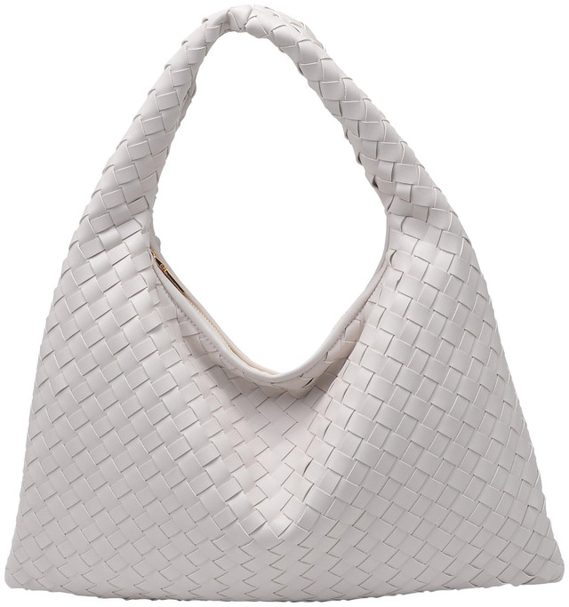 This slouchy woven bag is perfect for a laid-back yet stylish look. The gold hardware adds a touch of glam, while the fabric lining, and interior pockets keep your essentials organized and within reach. The zipper closure ensures everything stays secure, making it a practical and fashionable choice. Measures 15.5 L x 2.75 W x 9.625 H.