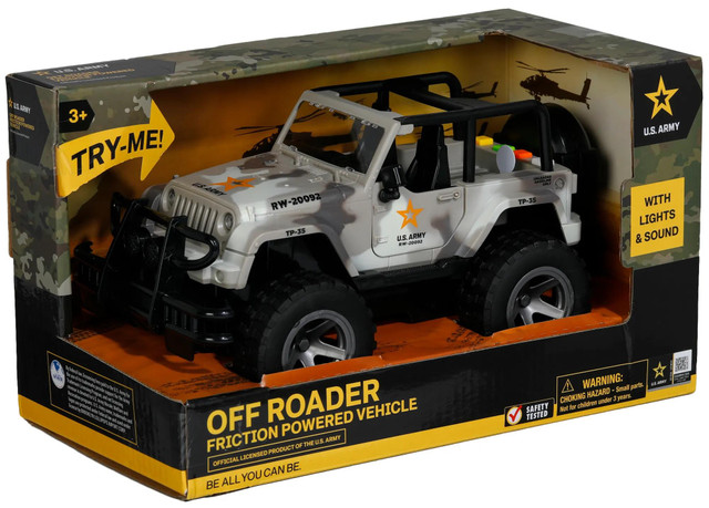 This kids friction powered Army vehicle is built for adventure, featuring an off-road design with lights and sounds for exciting play. The doors open and close for added realism, and batteries are included so the fun can start right away.