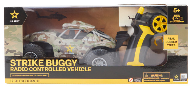 Gear up for action with the U.S. Army Strike Buggy RC Vehicle in digital sand camouflage. Officially licensed and fully functional, it drives forward, backward, left, and right with a 4050 ft range. The antenna extends for better control, and working headlights light up the path ahead.