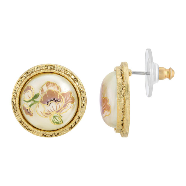 Elevate your elegance with our round goldtone earrings, featuring a floral decal on creamy ivory faux pearl. These earrings exude timeless classic vintage charm, making them a sophisticated addition to any outfit. Perfect for any occasion, they add a touch of refined style to your jewelry collection. Length .75 in., width 20mm.
