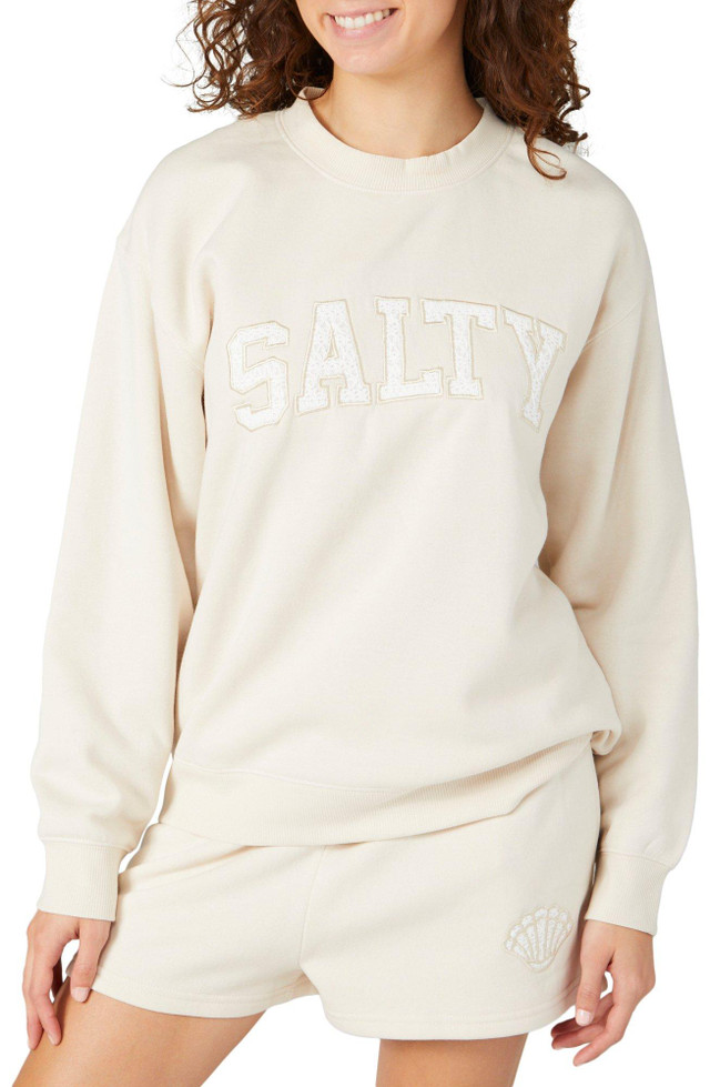 Stay cozy and stylish with our Juniors Salty Crew Neck Pullover. Made from a blend of cotton and polyester, this pullover features a stylish solid color and an embroidered Salty script on the chest. The crew neckline and inner fleece lining ensure warmth and comfort, making it perfect for casual outings or lounging at home. Combining fashion and functionality, this pullover is a versatile addition to your wardrobe.