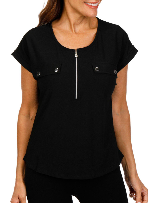 Refresh your everyday look with this womens short sleeve zip neck top. Designed with roll cuff sleeves, faux chest pockets, and a sleek quarter zip neckline, it blends casual comfort with polished style. Lightweight and stretchy in a soft polyester-spandex blend, it's perfect for workdays or weekend plans.