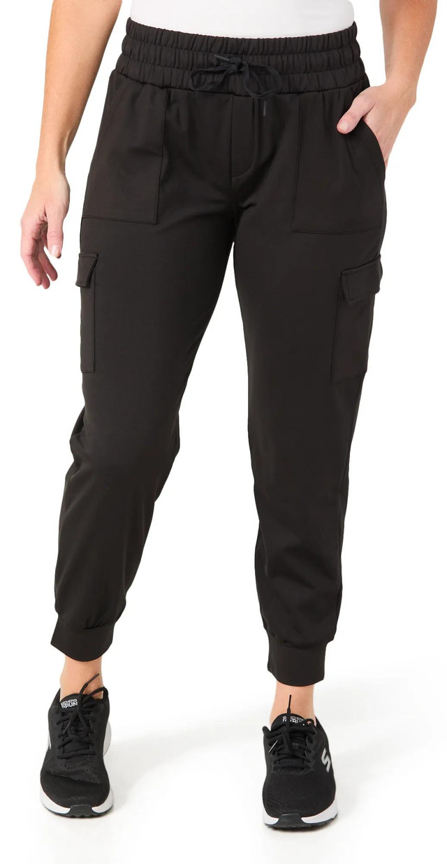 These womens active joggers blend comfort and utility with a solid color design and elastic waist with drawstring for the perfect fit. Featuring classic pork chop pockets and flap cargo pockets on the legs, they offer both style and function. Great for active days or casual wear. Inseam is approximately 26 in. Fabrication is 86% polyester and 14% spandex.