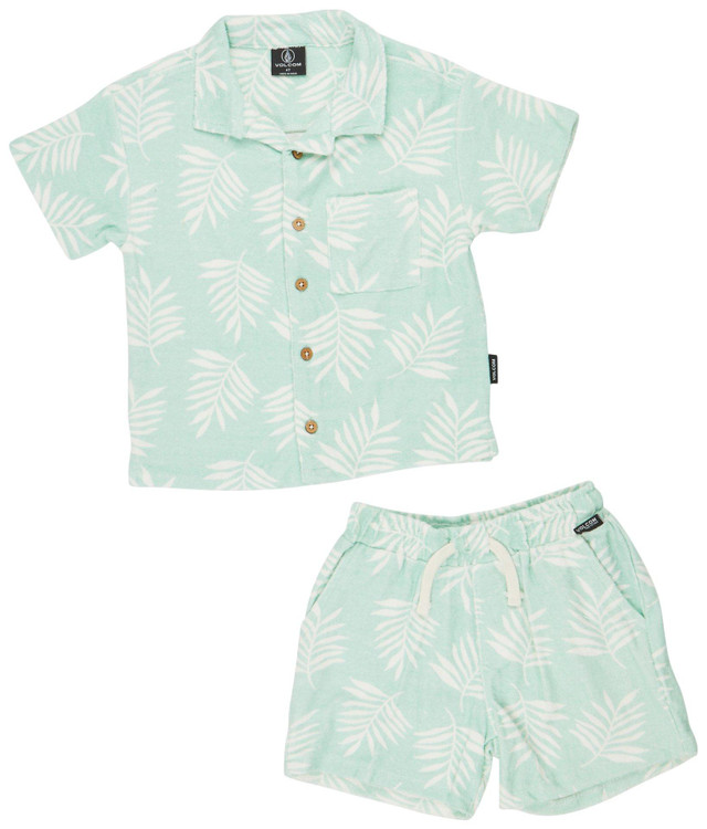 Bring the island vibes to his everyday play with the Toddler Boys 2 Piece Towel Terry Tropical Shorts Set. Features a soft terry tank top with vibrant tropical graphics, paired with matching shorts for a breezy, beach-ready look. Made for comfort and movement, this set is perfect for sunny outings, splashy adventures, or laid-back lounging. Whether he's building sandcastles or chasing waves, this outfit keeps him cool, comfy, and full of tropical charm.