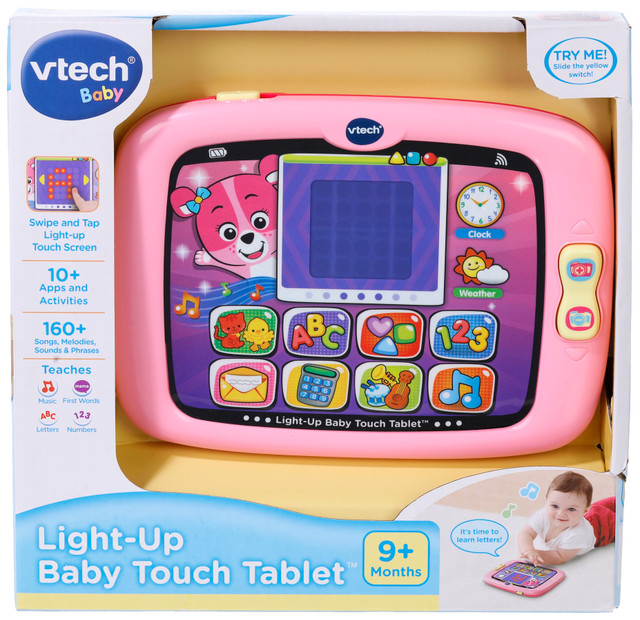 Learn letters, numbers, shapes and more on the Light-Up Baby Touch Tablet. This tablet encourages imaginative play and includes more than 10 apps and activities for your child to explore. Pressing the eight learning app buttons introduces your child to letters, shapes, counting, numbers, instruments, animals, first words and music. Your child can also explore special apps and open pretend e-mails, take pretend pictures or check the time and weather just like mom and dad.