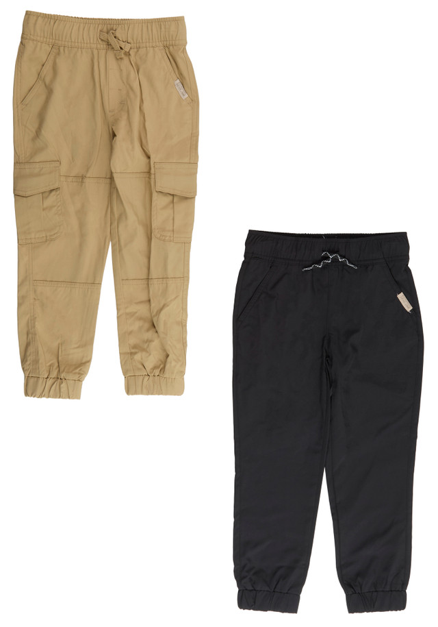 This 2 pack of little boys cargo joggers features an elastic waistband with drawstring for a secure fit. Designed in solid colors with side seam pockets, they offer comfortable and versatile options for active play or everyday wear. Fabrication is 92% polyester and 8% elastane.